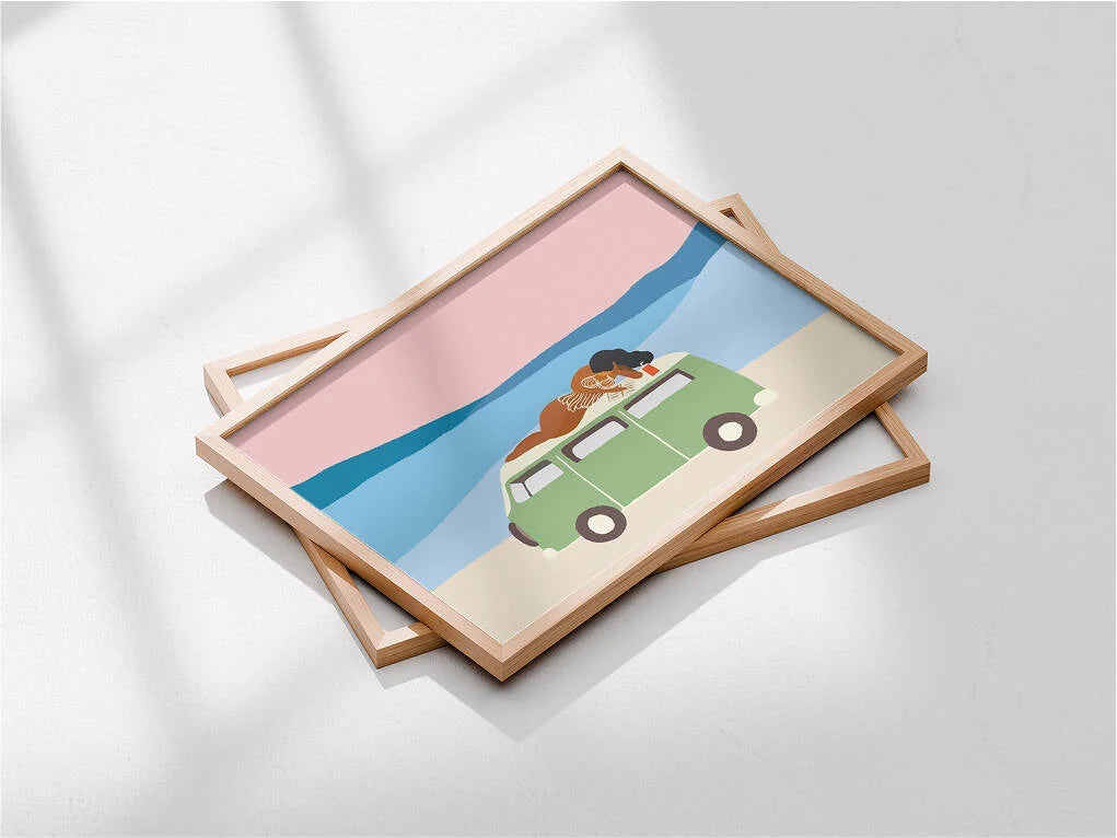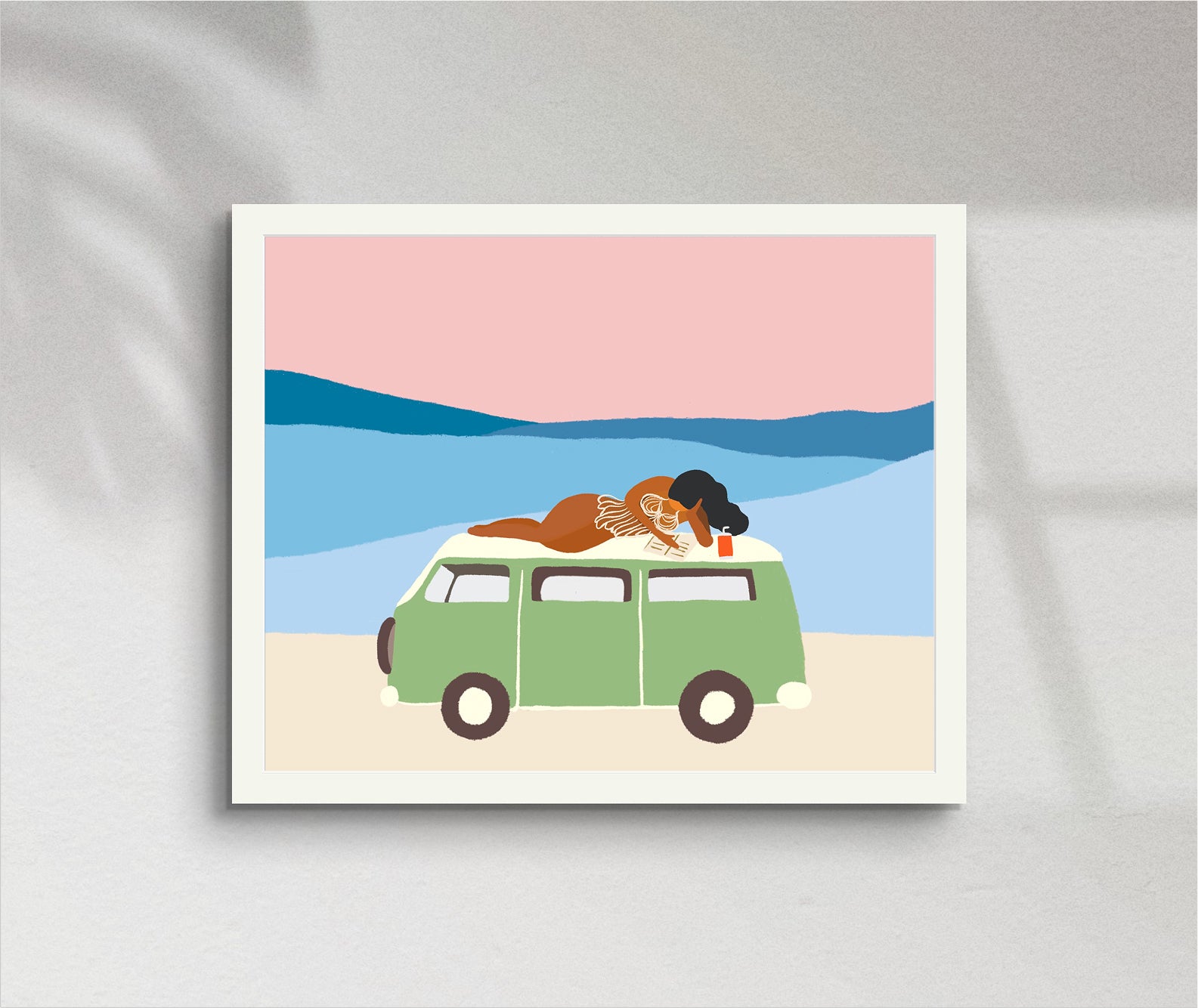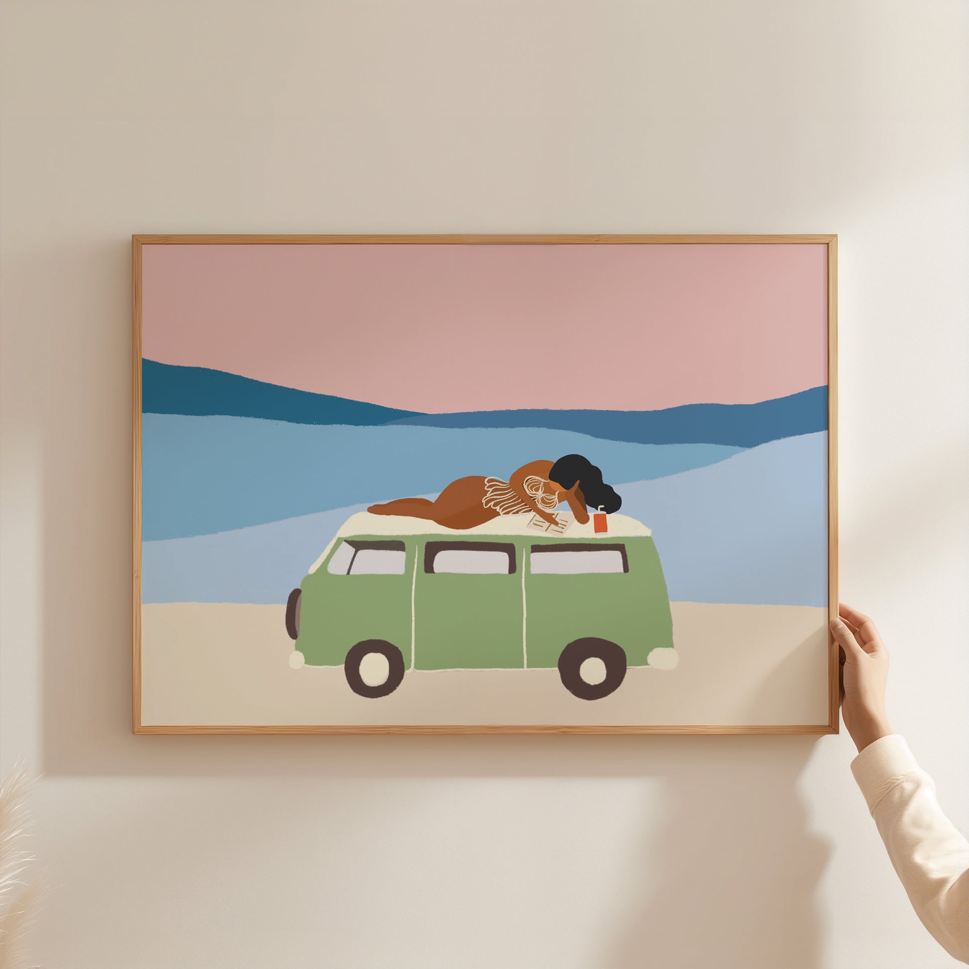 A woman lounges atop a green van by the sea, lost in a book as a coral-pink drink rests nearby. The scene is calm and effortless, with soft waves and a pastel sky stretching behind her. Blending stillness with wanderlust, this artwork captures a perfect island moment where stories and scenery gently flow together.