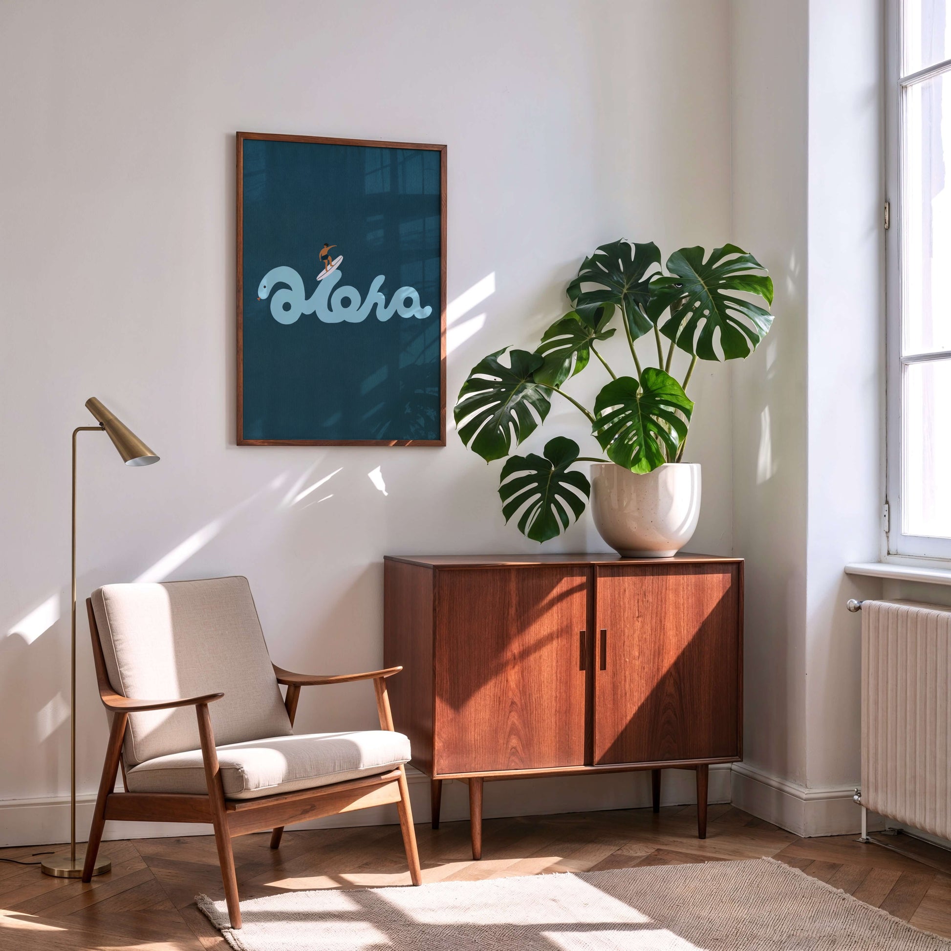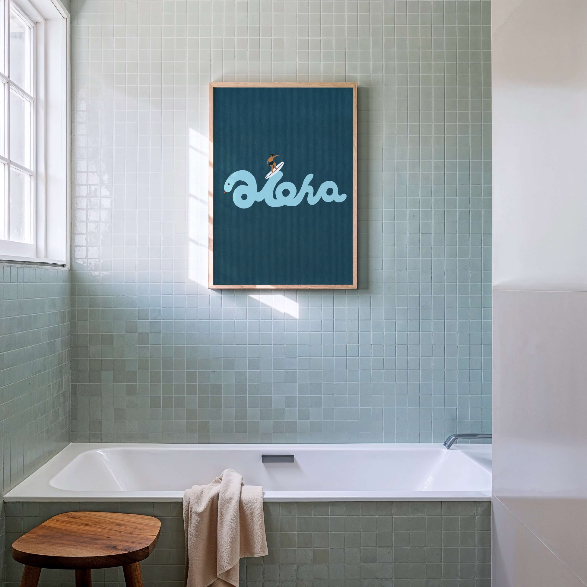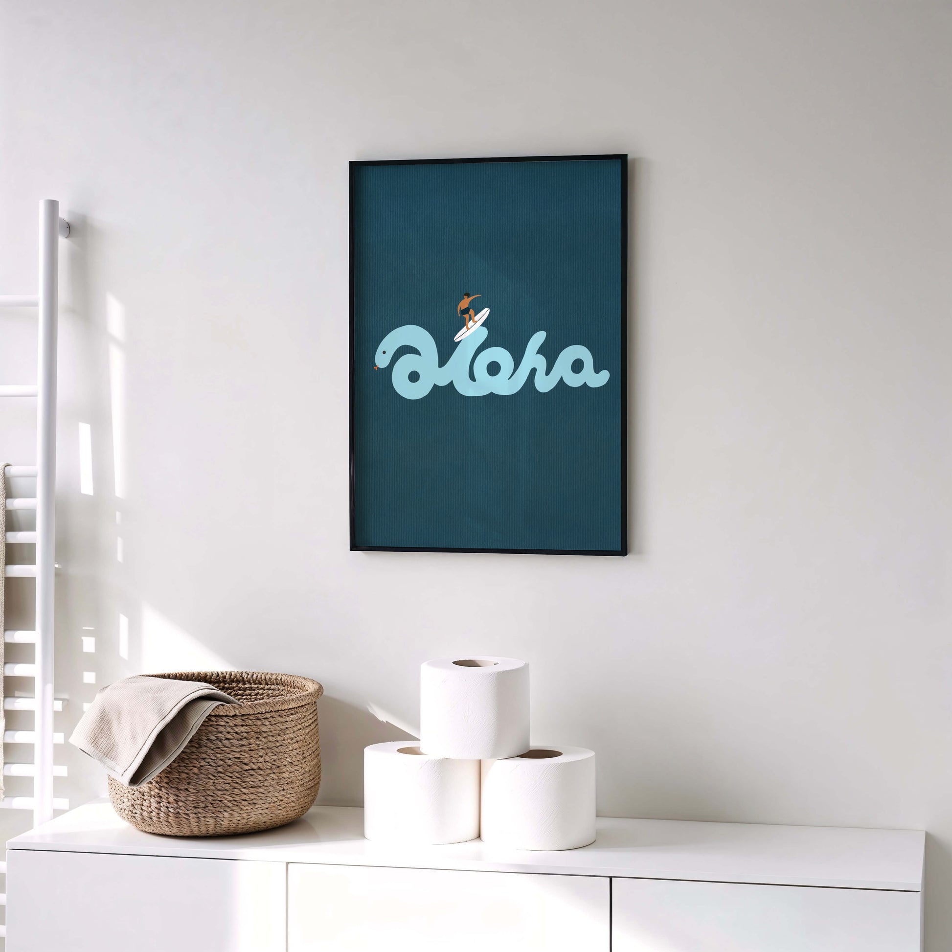 This stylized artwork features the word “Aloha” flowing like a wave, shaped with a playful twist into a soft blue serpent. A male surfer rides the crest of the looping letter, balanced and effortless, symbolizing harmony with nature’s rhythm. Set against a textured deep-sea background, the piece celebrates motion, balance, and the gentle power of island life. A joyful blend of typography, surfing, and imagination.