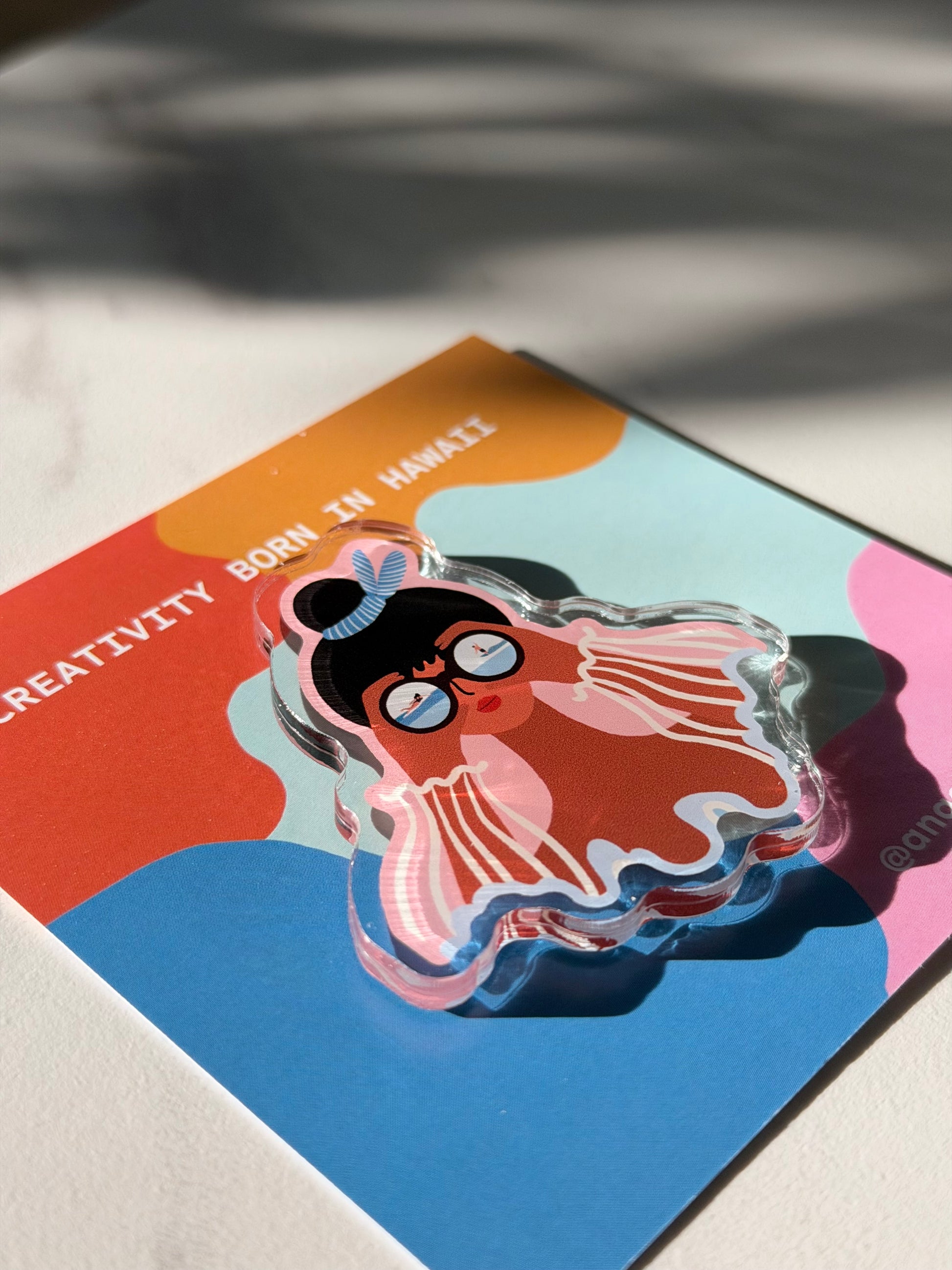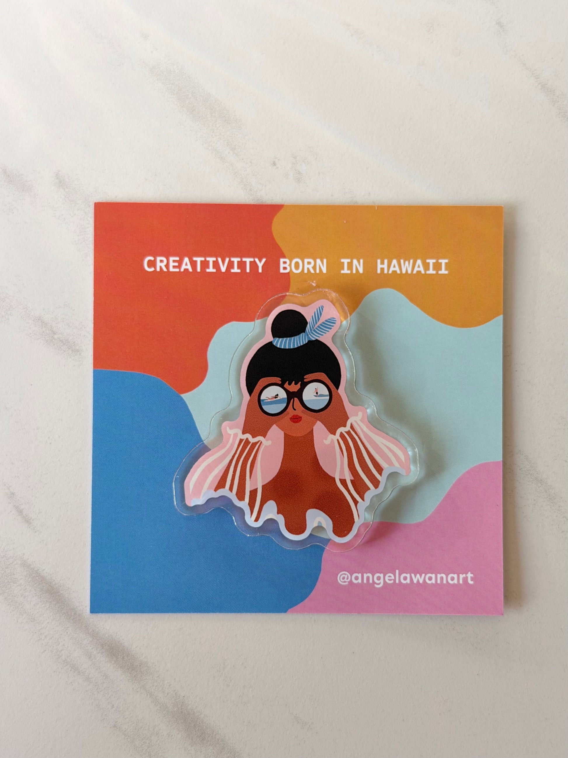 Designed by Honolulu artist Angela Wan, this magnet captures her signature island-life aesthetic: bright colors, clean lines, and gentle joy. It’s the perfect small gift for ocean lovers, travelers, surfers, artists, and anyone who dreams of Hawaii.