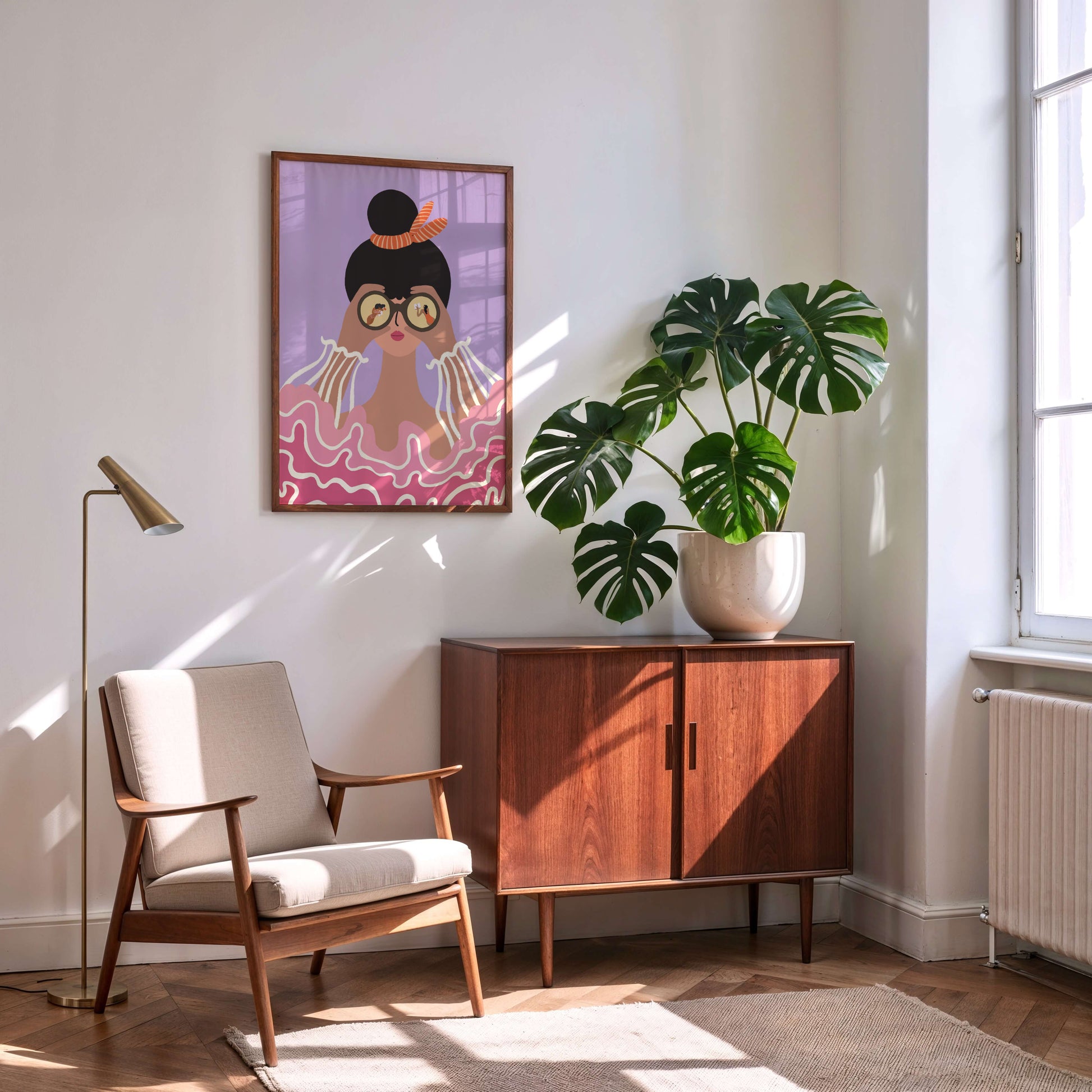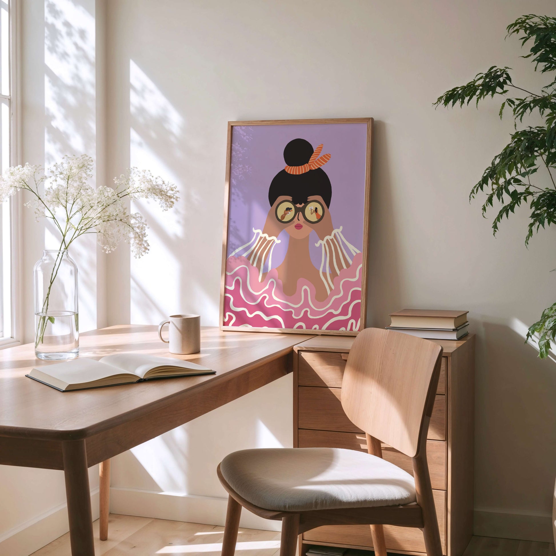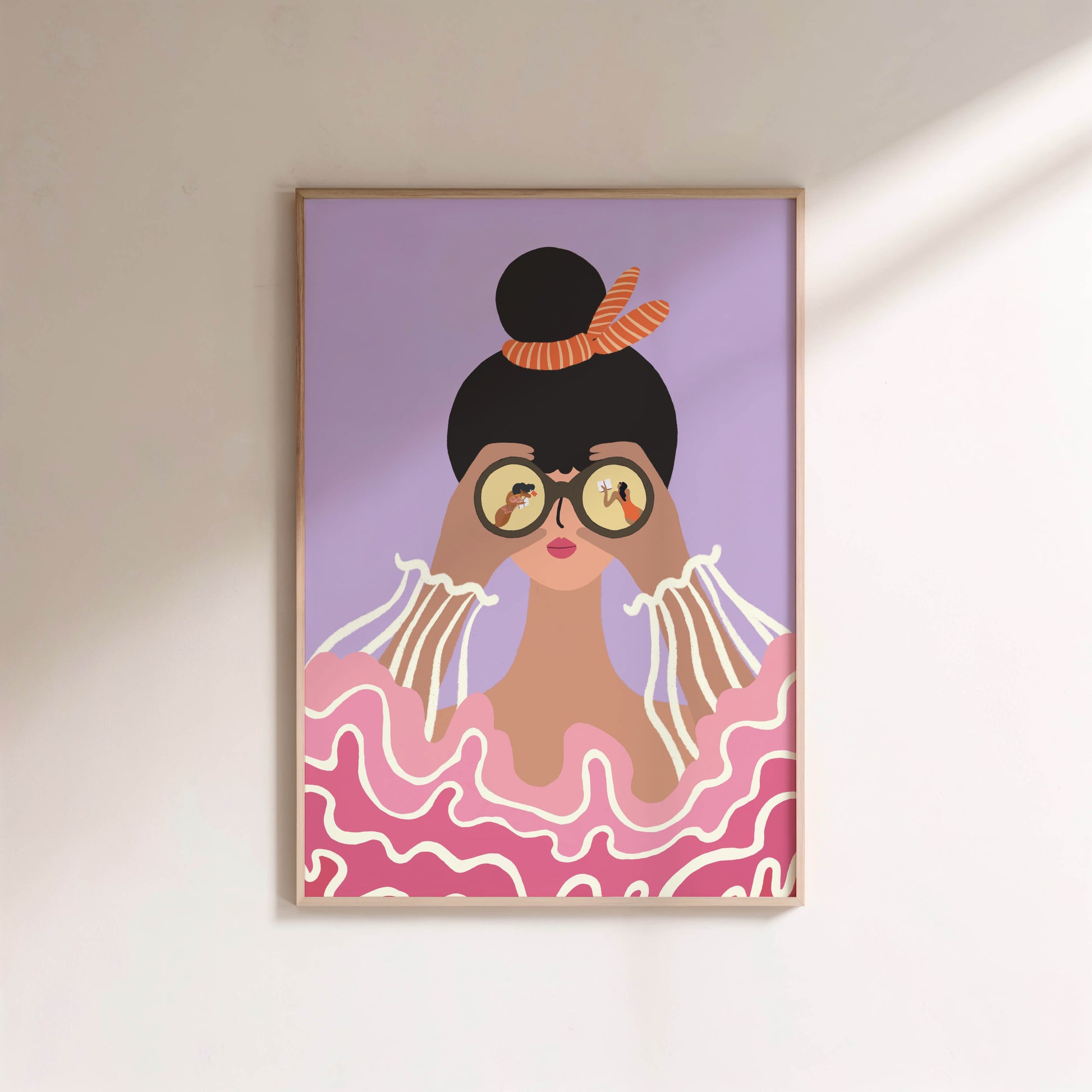 A woman stands by the sea, binoculars lifted, gazing toward the horizon. Inside her lenses, tiny moments unfold—stories, people, possibilities. Surrounded by soft pink waves and a dreamy lavender sky, this artwork blends strength and softness, curiosity and calm.