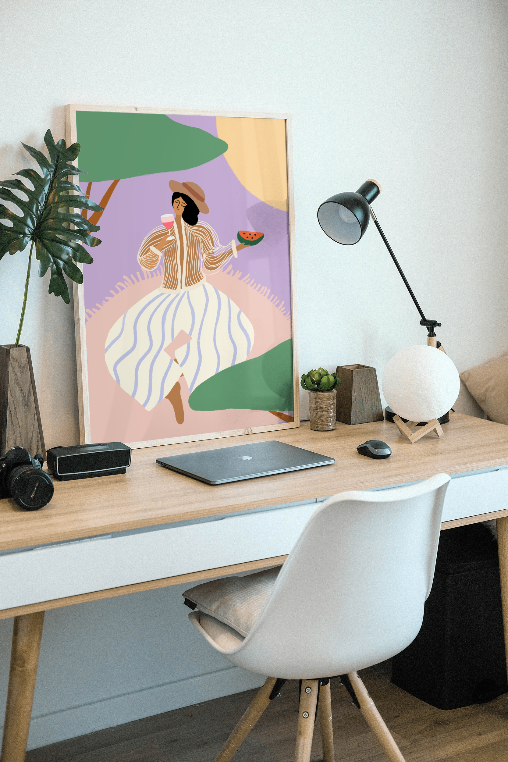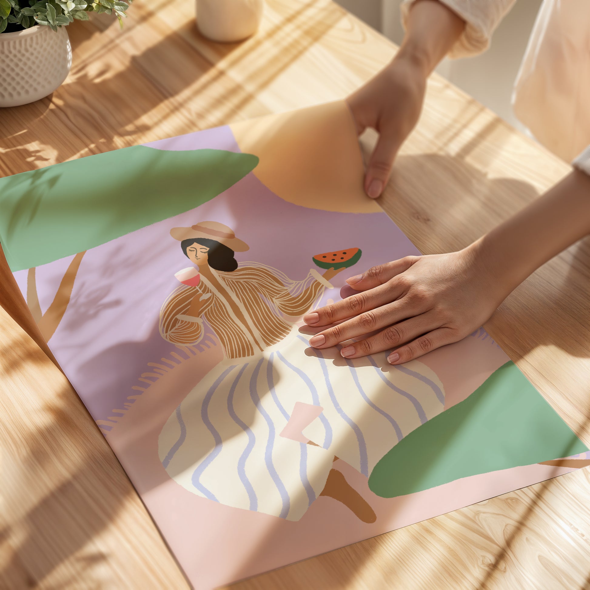 "Under the Sweet Shade" captures a serene moment of leisure—a girl relaxes on a picnic mat, sipping a drink and enjoying a slice of watermelon under the cool tree shade. This artwork embodies the joy of simple pleasures, celebrating the beauty of slowing down and enjoying the present moment.