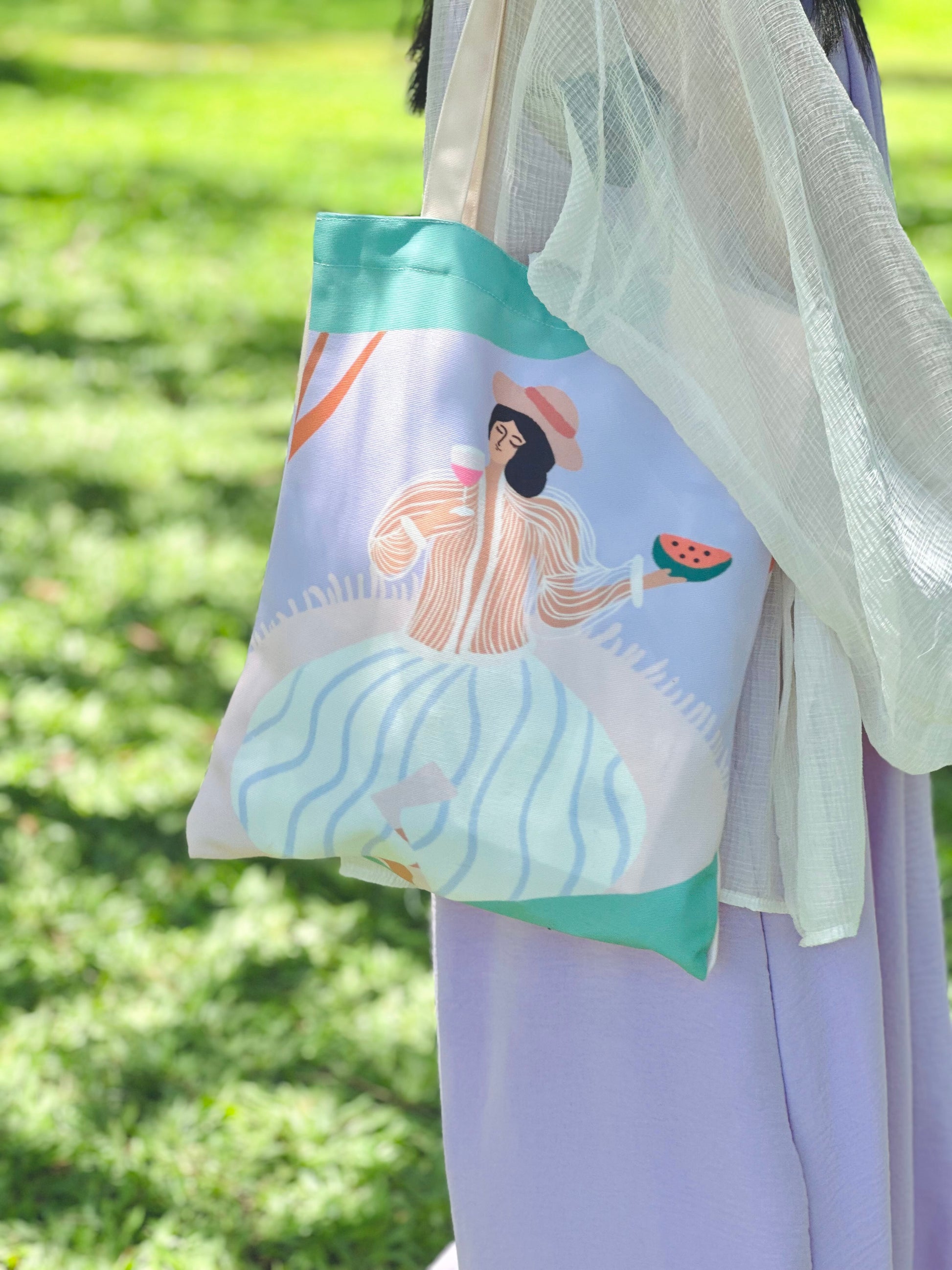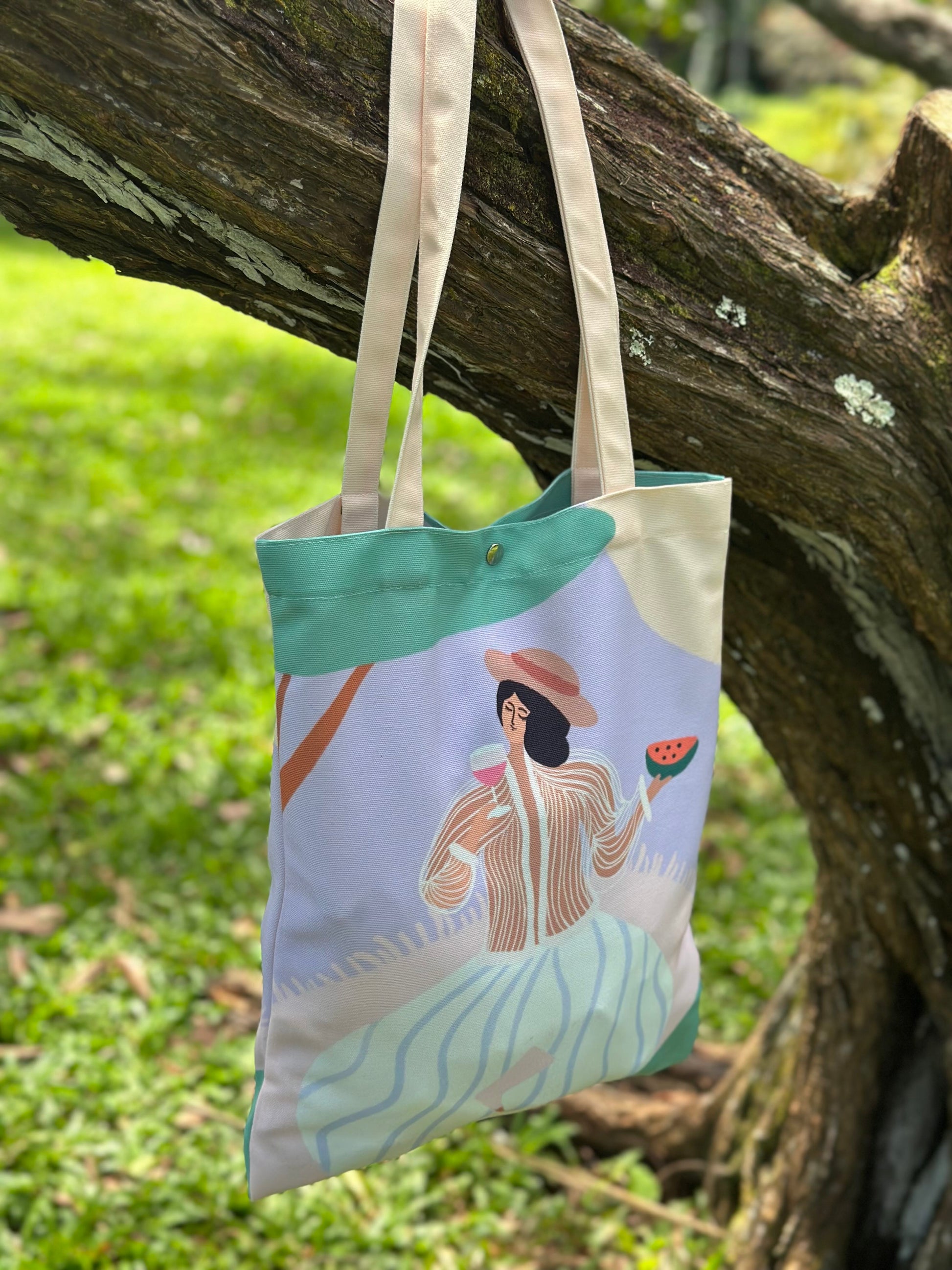 Carry a piece of serenity with you with this Under the Sweet Shade tote bag. Featuring a girl relaxing on a picnic mat, sipping a drink, and enjoying a juicy slice of watermelon under the cool shade of a tree, this design captures the essence of leisure and simple pleasures.